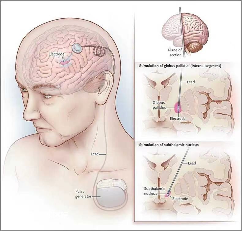 腦深部電刺激(DBS)俗稱“腦起搏器”,是一種先進的神經(jīng)調(diào)控技術(shù),是通過立體定向技術(shù)將刺激電極植入深部腦中特定神經(jīng)核團(如丘腦底核,蒼白球內(nèi)側(cè)核等), 連接這些電極的電線通過耳后及后頸部的皮下隧道連接至埋在鎖骨下胸部的脈沖發(fā)生器中。當這個裝置被開啟時,電流會通過腦內(nèi)電極對植入的目標區(qū)域發(fā)出高頻的電刺激,以此來抑制神經(jīng)元的異常電活動,幫助大腦恢復正常的神經(jīng)信號傳導,從而達到減輕患者運動障礙癥狀、提高生活質(zhì)量的目的。